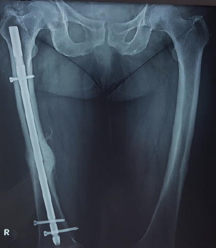 intra-medullary nailing of the right femur and conservative treatment of the left side. Uneventful union occurred on both sides.