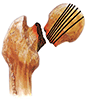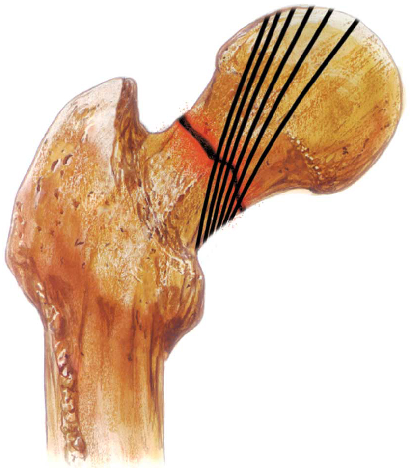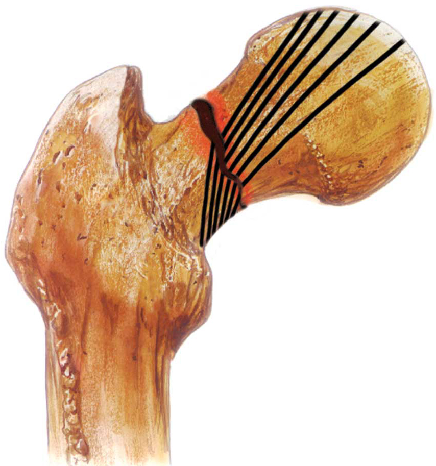 La cabeza femoral se inclina hacia una posición en varo, y el patrón trabecular de la cabeza del fémur no está alineado con el del acetábulo.
