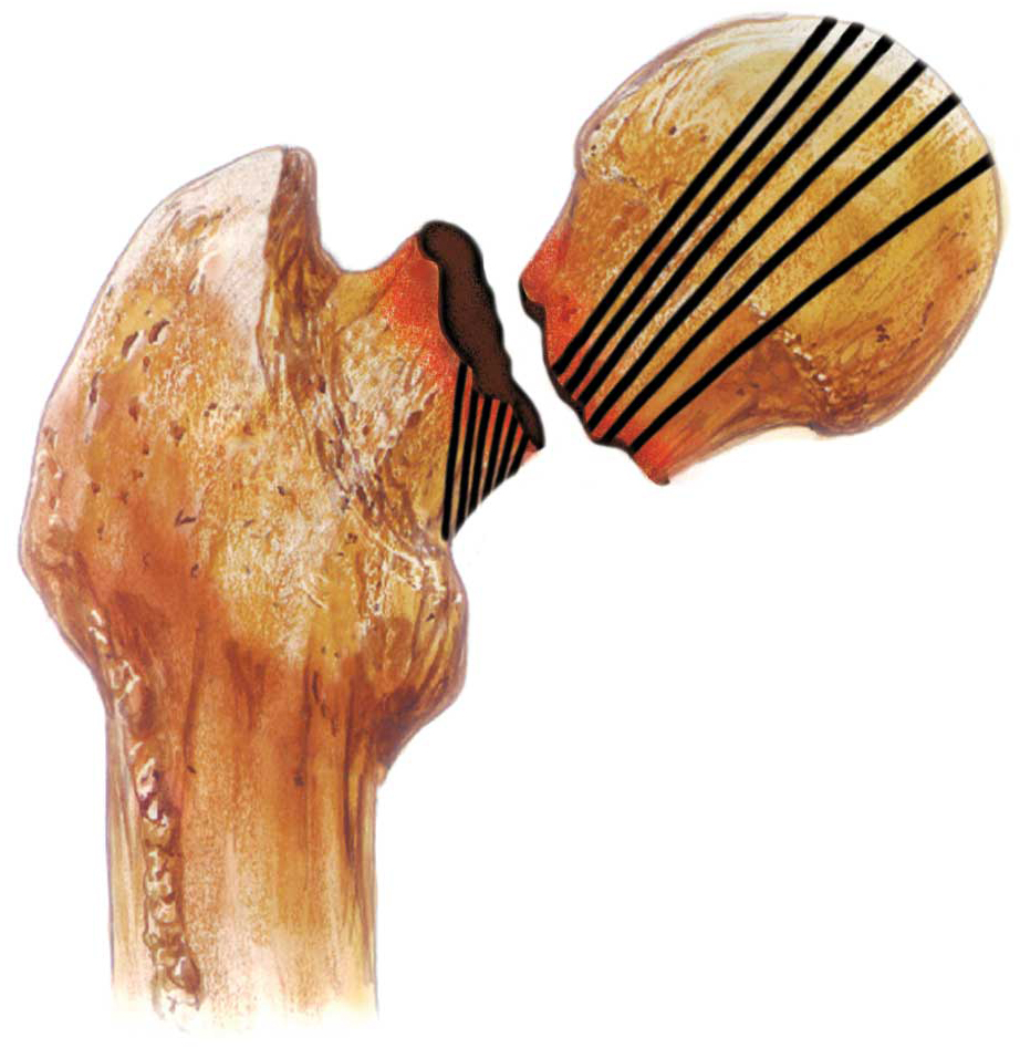 Al igual que en la fractura tipo I, los fragmentos pueden sucumbir a las fuerzas de rotación laterales y desarrollar el desplazamiento de separación subcapital.