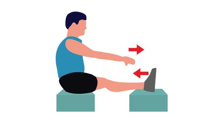 Sentado con las piernas extendidas y apoyadas en un taburete, intentar tocarse la punta de los pies con las manos (mantener la punta de los pies hacia la cabeza).