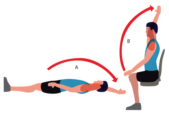 Flexión del Hombro (Asistido): Una sus manos (entrelazadas) y levante los brazos por arriba de la cabeza. Se pueden también hacer acostado (Figura A) o sentado (Figura B). Mantenga los codos lo mas derecho posible. Haga de 10 a 20 repeticiones, 3 veces al día.