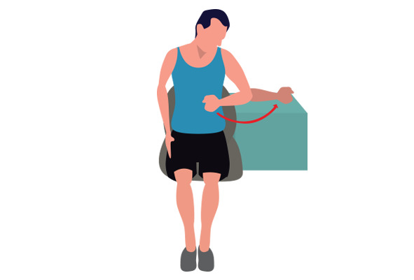 Rotación del Hombro con apoyo: Mantenga el codo apoyado en un lugar (como muestra la figura) y las escápulas (paletas) hacia abajo y juntas. Gire el antebrazo hacia delante y hacia atrás. Repitiendo 10 veces; realice este ejercicio 3 veces al día.